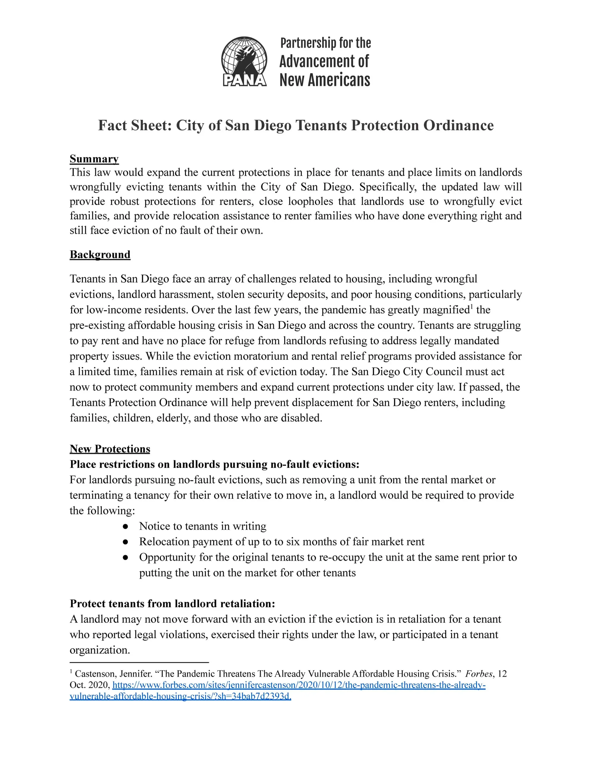 Our proposed Tenant Protections Ordinance would expand current protections in place for tenants and close loopholes by placing limits on landlords who are wrongfully evicting tenants within the City of San Diego. The updated law will provide robust protections for renters, close loopholes that landlords use to wrongfully evict families, and provide relocation assistance to renter families who have done everything right and still face eviction of no fault of their own.
